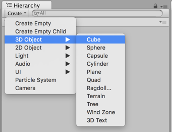 GameObject > 3D Object > Cube - ヒエラルキーウィンドウから、
