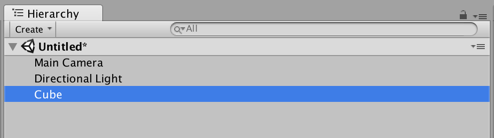 配置したオブジェクトはヒエラルキーウィンドウのリストに追加されます。 プロジェクト作成時に最初から配置されているオブジェクトが2つに加えて、今追加したオブジェクトのCubeが追加されている事がわかります。