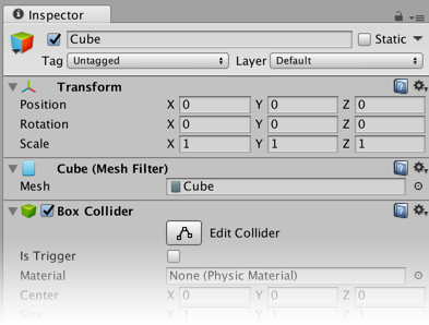 | Transform | オブジェクトの座標や表示上の大きさ、回転の角度などの値を管理しています |