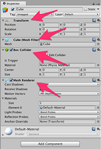 例えばCubeオブジェクトが最初から持っているコンポーネントは下記になります。