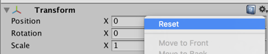 右上の ギアアイコン をクリックしたら出てくるドロップダウンメニューからResetを選択すると、Cubeオブジェクトをシーンビューの中心点である(0, 0, 0)の座標に移動させる事ができます。