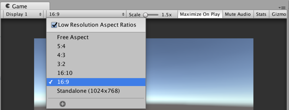 ゲームビューのレゾリューションは初期設定ではFree Aspectで表示されていますが、作ったものの位置やサイズを後から変更しなくて済むように、最初の段階で実際のゲーム画面に合わせるように設定しましょう。