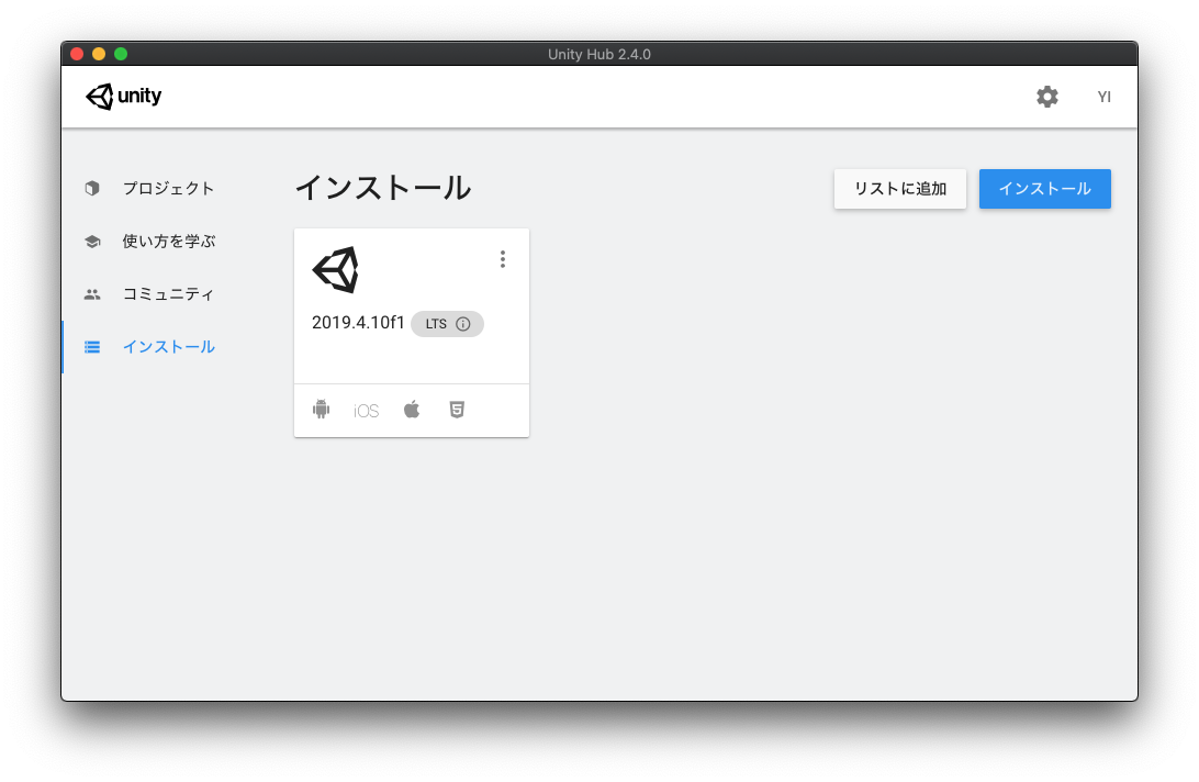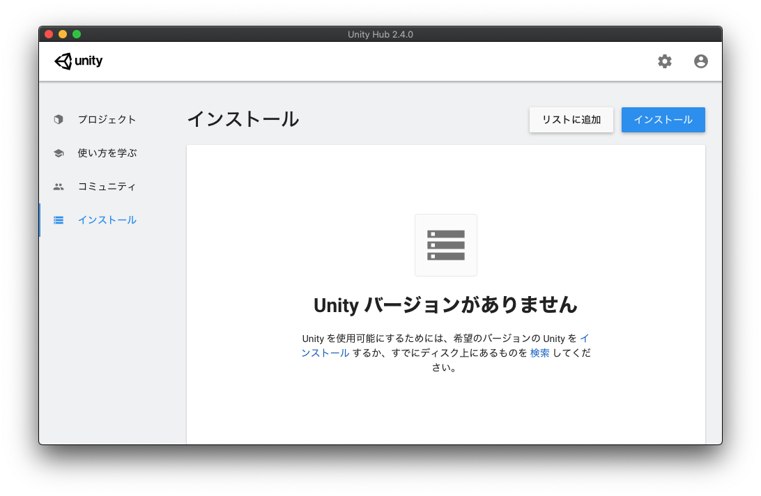 左メニューの「インストール」を選択するとUnityのインストール画面に遷移します。