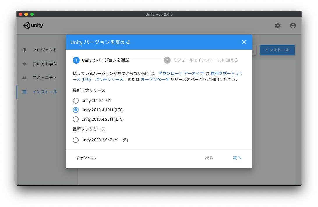 バージョンを選んで、Unityをインストールする