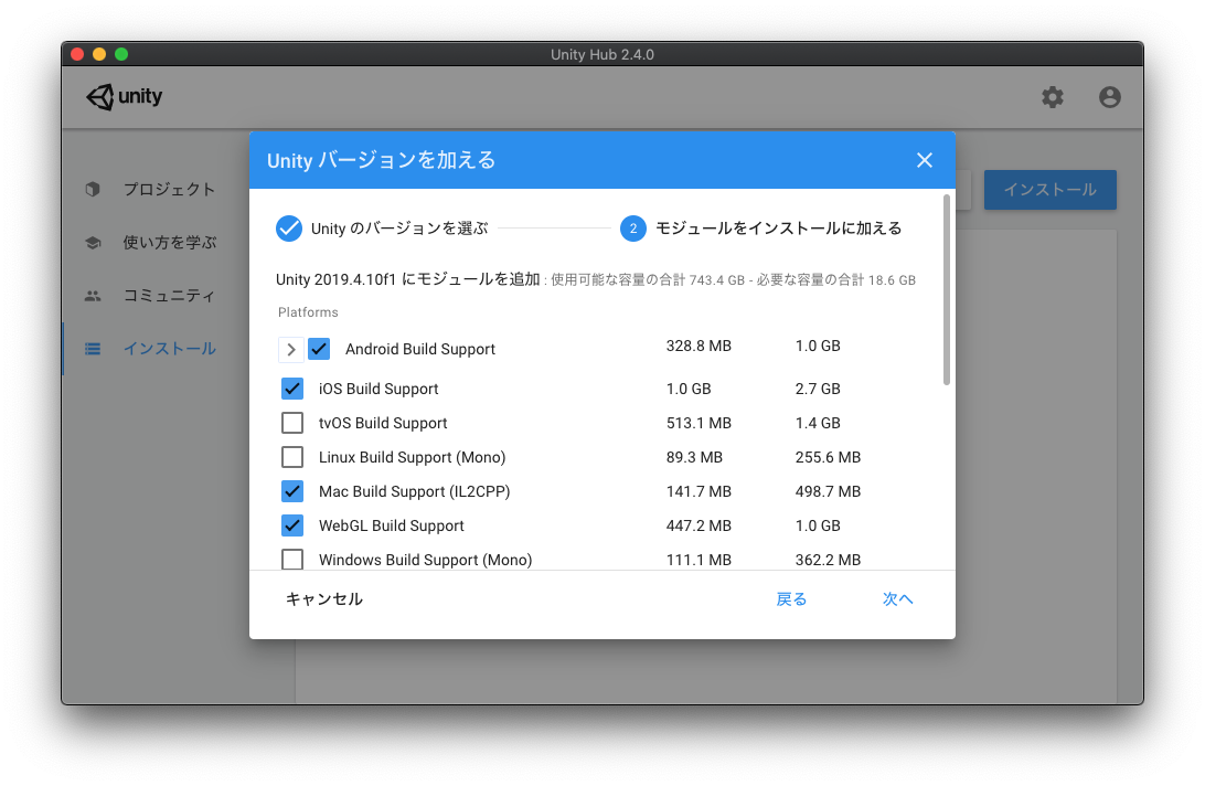 「次へ」をクリックするとモジュールを加える画面に移動します。 AndroidやiPhone、Mac単体やウェブブラウザでゲームがプレイできるように書き出したい場合などに、必要な項目にチェックを入れて追加でダウンロードする事が可能です。容量が重いので回線が細い時には気をつけましょう。 これらのモジュールは後から追加してインストールする事が可能です。